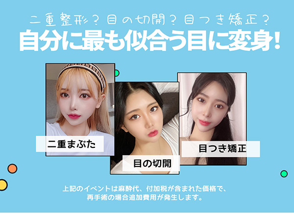 二重まぶた+目の切開(目頭切開・目上切開)+目つき矯正 全部合わせて99万W(麻酔代、付加税込み)になります。 (再手術、二重まぶた切開法で行う場合イベントが適用されません)