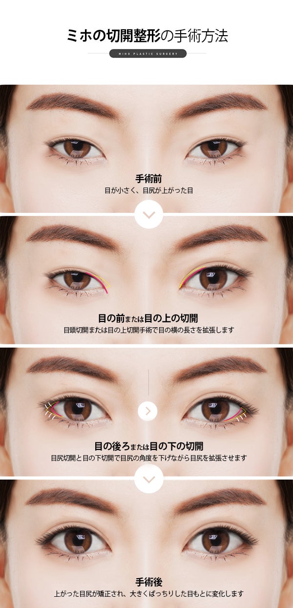 目の切開手術はふつう二重手術と共に行っておりますが、 二重のラインは気にならない方なら 目元の雰囲気や目の大きさだけ矯正できるように 目の切開手術だけ受ける方も多いです。 目の切開手術について 無料オンライン相談が必要でしたら ライン、カカオトークまでお問合せお願いいたします。