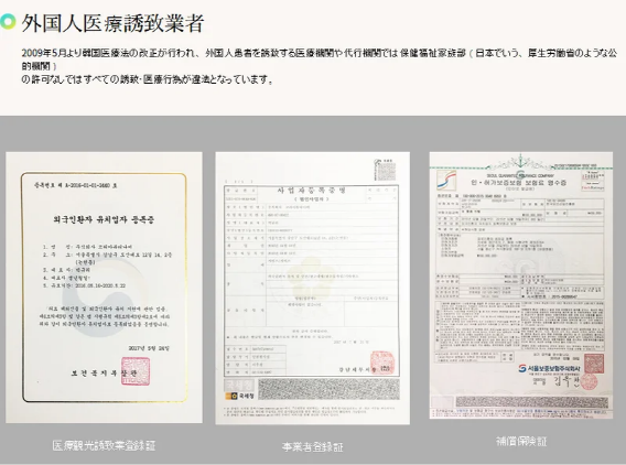 私どもが紹介している提携病院は全て韓国政府に認証された病院だけを選び提携しております。 韓国政府の外国人患者誘致業者認証を取得するには 1.会社の資本金が1億ウォン以上であること 2.外国人患者損害保険に加入していること が必要になりまして、弊社は上記の全ての条件を満たして許可を得て活動していますのでご安心下さいませ。 ![]() |