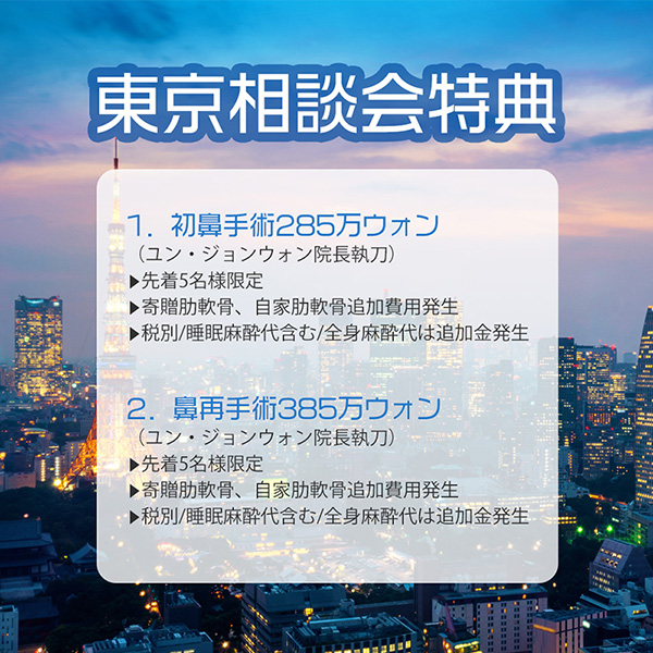 1. 初鼻手術285万ウォン (ユン・ジョンウォン院長執刀) ▸先着5名様限定 ▸寄贈肋軟骨、自家肋軟骨追加費用発生 ▸税別/睡眠麻酔代含む/全身麻酔代は追加金発生 2. 鼻再手術385万ウォン (ユン・ジョンウォン院長執刀) ▸先着5名様限定 ▸寄贈肋軟骨、自家肋軟骨追加費用発生 ▸税別/睡眠麻酔代含む/全身麻酔代は追加金発生 3. ユン・ソクホ代表院長指定鼻手術 どんなプランでも、どんな材料を使用しても追加金無し!