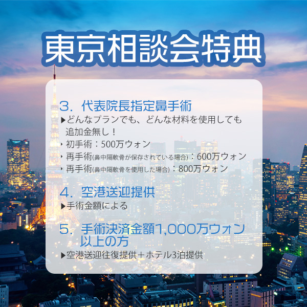 ‣ 再手術(鼻中隔軟骨が保存されている場合):600万ウォン ‣ 再手術(鼻中隔軟骨を使用した場合):800万ウォン (麻酔代含め・税別) ⁕リフテラ/テンサーマ/シュリンクの中で選択1サービス 4. 空港送迎提供 ▸手術金額による 5. 手術決済金額1,000万ウォン以上の方は 空港送迎往復提供+ホテル3泊提供