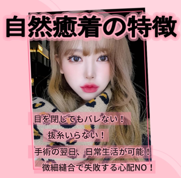 自然癒着の特徴は 手術をして目を閉じたときにバレないです。 それほどとてもナチュラルです。 また抜糸もいらないです。 抜糸がないので手術後に治療が他にないです。 ダウンタイムが長くないで日常生活も 翌日から可能となります。